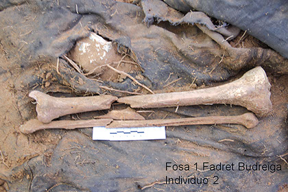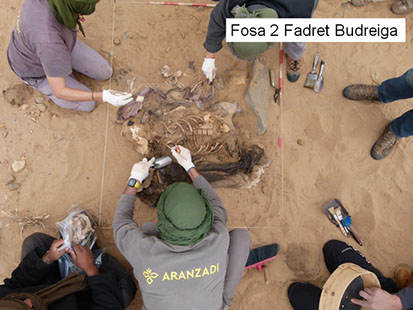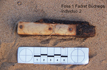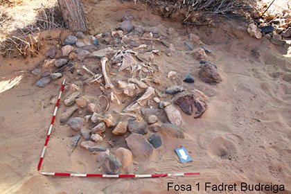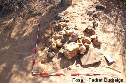 Fosa rectangular de 2,20 por 1,80 metros en cuyo interior y a una profundidad de 50 cm bajo las piedras se encuentra los restos esqueléticos de dos individuos con prendas de vestir. El esqueleto superior se encuentra muy desarticulado e incompleto como consecuencia de la acción tafonómica y la escasa cubierta de arena. El inferior se encuentra bien conservado y con prendas de vestir. A 150 metros de la fosa se recupera una vértebra lumbar sobre el lecho de arena de la cárcava.
