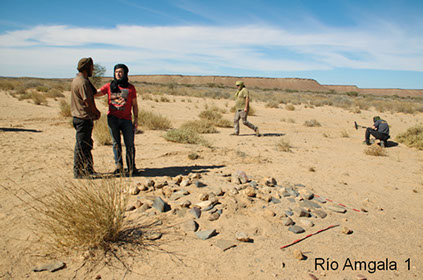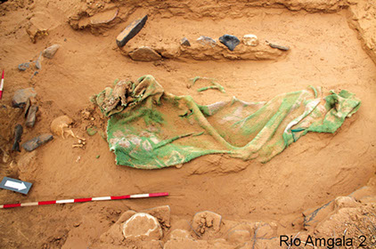 Enterramiento individual sobre un montículo arenoso con vegetación arbustiva a su alrededor en la zona central del lecho del Río Amgala. Se encuentra bajo una capa de arena de 50 cm y envuelto por una manta de colores verde y blanco.