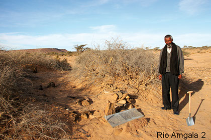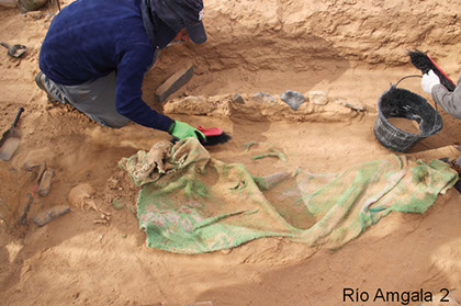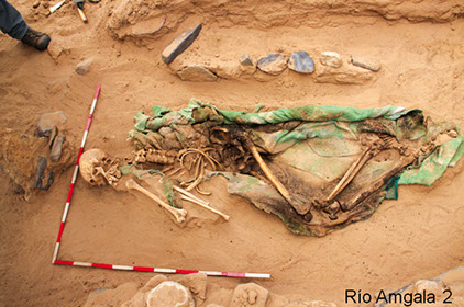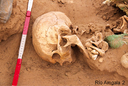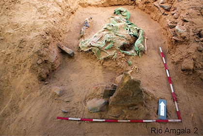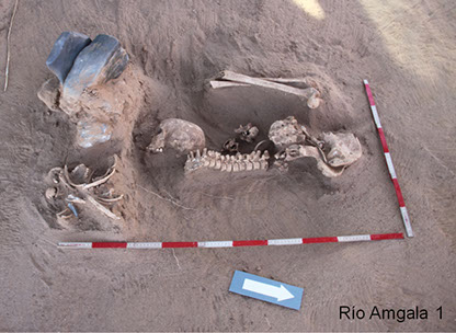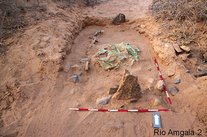Como ya se ha relatado en apartados precedentes en la fosa de Río Amgala 2 fueron hallados los restos de una persona. Las características del entierro y de los propios restos muestran que se trataba de una persona adulta mayor, y que el lugar había sido señalado posteriormente siguiendo la tradición islámica. Se trataba de un entierro precario, en condiciones de emergencia, encontrándose el cuerpo tapado con una manta.